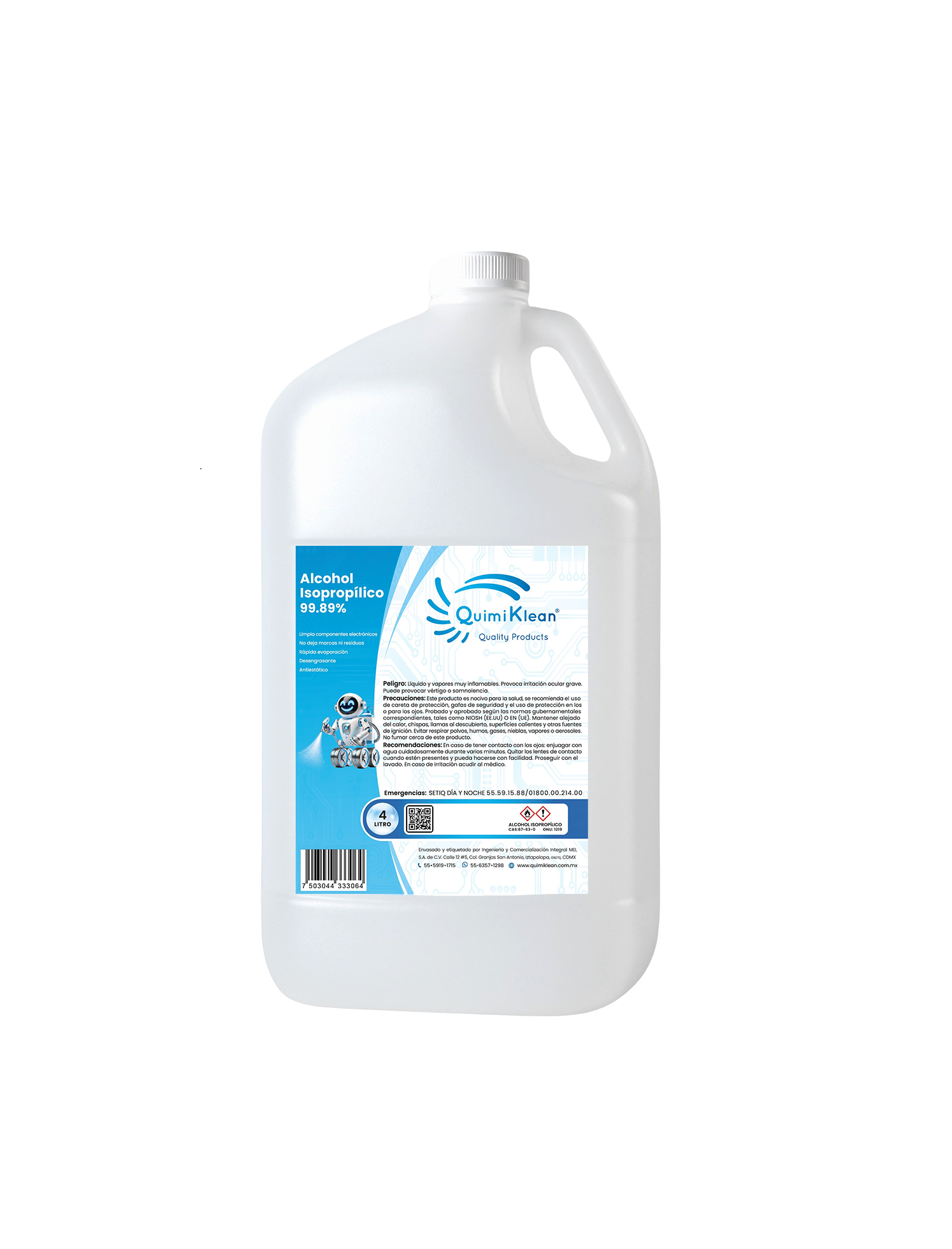 Es un producto químico de alta pureza (99.9%) con evaporación rápida y sin residuos, ideal para limpieza, desinfección y mantenimiento en procesos industriales y profesionales.